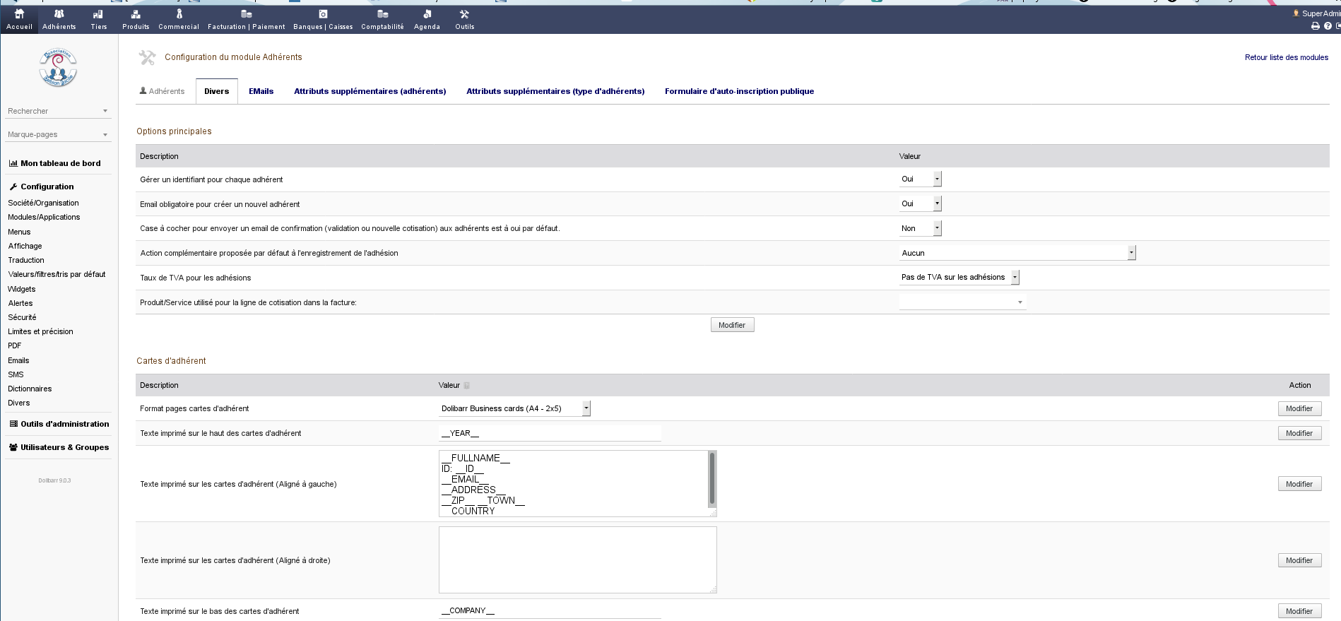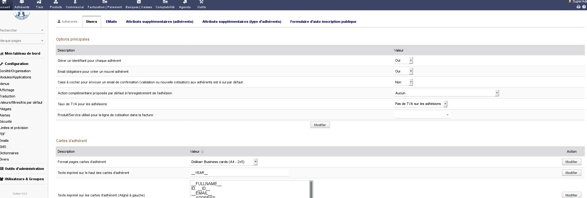 aller à la ligne Adhérents Gestion des adhérents d'une association, tout à droite de la page, cliquez sur le logo engrenage pour configuration du module Adhérents“, vous aurez à droite :