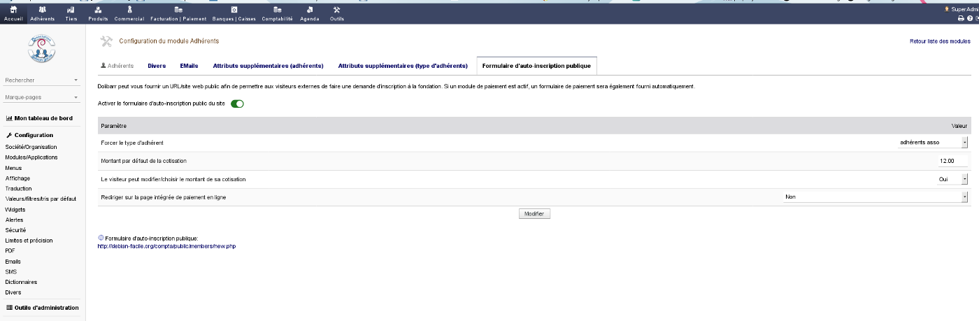 ce qui ouvre un autre formulaire, là vous faites “Activer le formulaire d'auto-inscription public du site ”, et modifier pour enregistrer