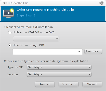 Içi nous avons la possibilité de choisir d'utiliser le lecteur CD/DVD-ROM de l'ordinateur ou une image ISO, ainsi que le type et la version du système d'exploitation.