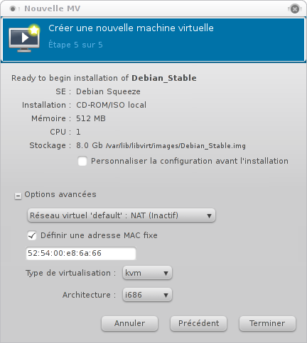 Dans notre exemple j'ai sélectionné kvm parce que mon processeur supporte la virtualisation matérielle et i686 parce que j'ai choisi d'installer une Debian Squeeze 6.0 32 bits. Le bouton Terminer permet de lancer la création de la machine et lance son démarrage.