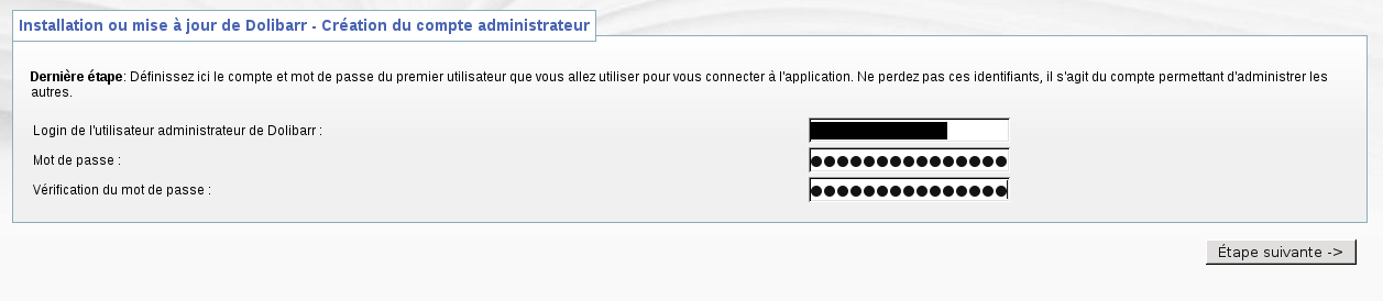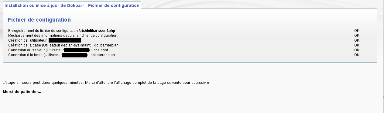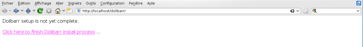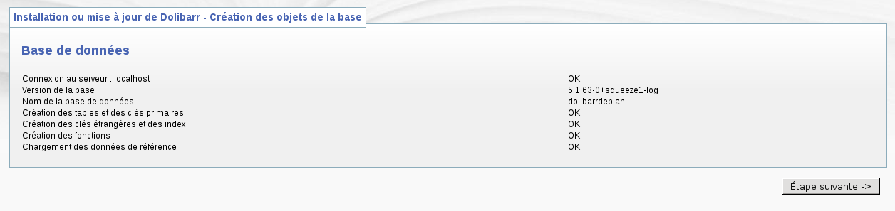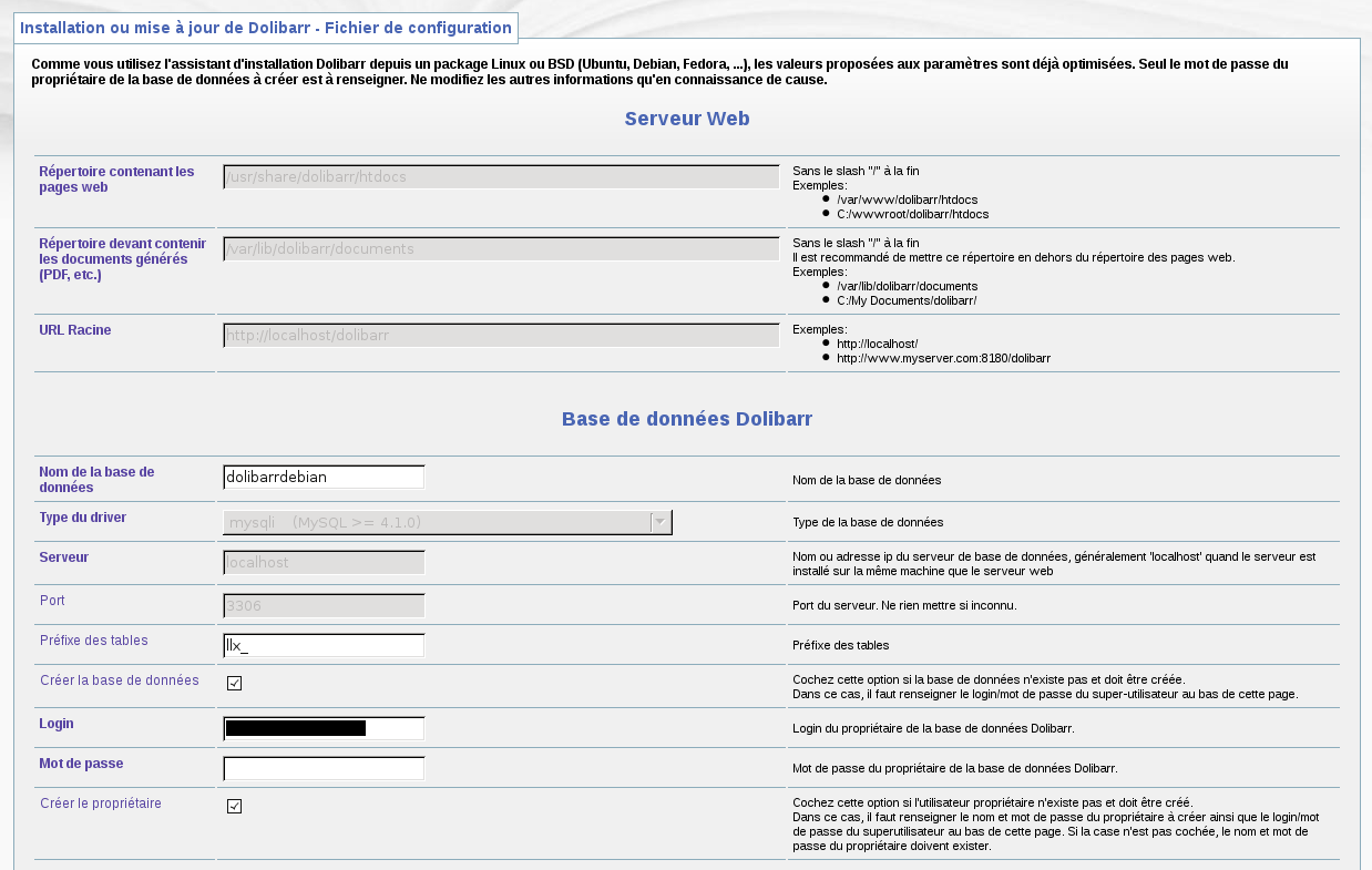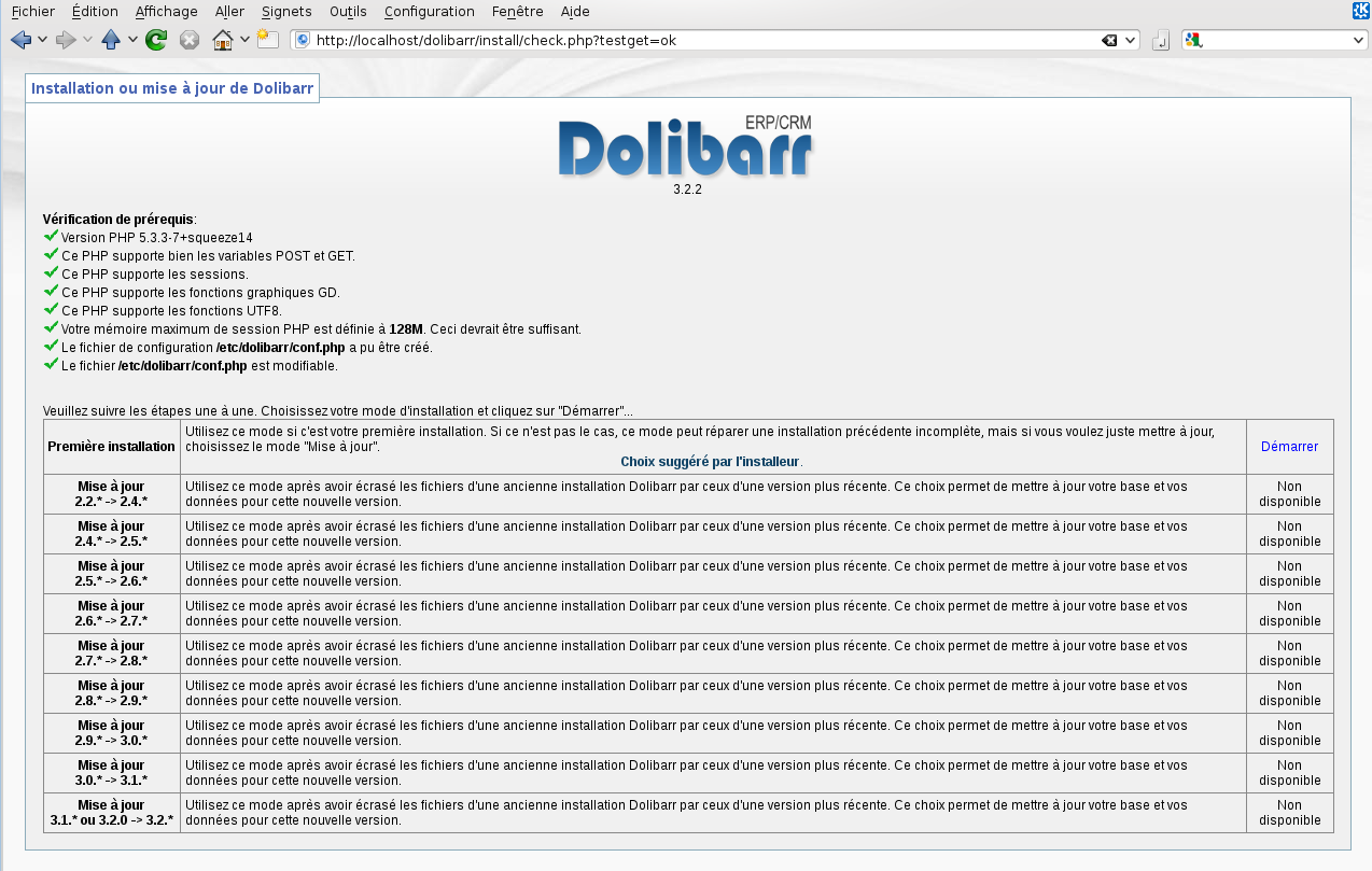 Sélection du paquet dolibarr précédemment désélectionné. (Lecture de la base de données... 116470 fichiers et répertoires déjà installés.) Dépaquetage de dolibarr (à partir de dolibarr_3.2.2+nmu1_all.deb) ... Paramétrage de dolibarr (3.2.2+nmu1) ... Run the dolibarr config script Ask for web server to setup Run the dolibarr postinst script Mysql superuser found to use is debian-sys-maint Create empty file /etc/dolibarr/conf.php Complete config of server apache2 Web user.group used is www-data.www-data Add link for Apache config file Restart web server using invoke-rc.d Reloading web server config: apache2. ---------- Call Dolibarr page http://localhost/dolibarr/ to complete the setup and use Dolibarr. ----------