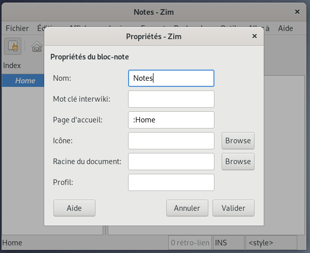 Avec un clic gauche sur le Fichier du menu, on obtient une liste dont l'une indique Propriétés d'où l'on peut modifier le titre du zim Notes en Cuisine :
