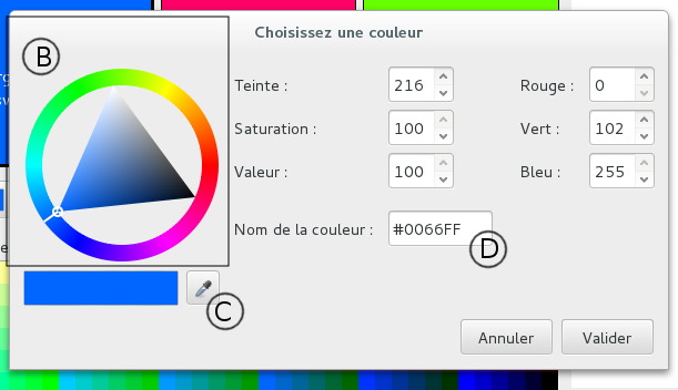 Sélectionnez une couleur sur le cercle extérieur puis ajustez votre choix sur le triangle intérieur. Il est aussi possible d'affiner la couleur en utilisant les boites de contrôle situées à droite de la roue grâce à leur petites flèches pour augmenter ou diminuer chaque valeur (teinte, saturation, valeur, rouge, vert, bleu).