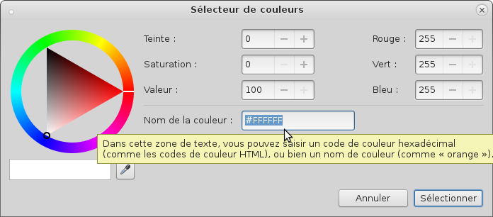 | Sélecteur de couleurs: | Choisir une couleur dans une boîte de dialogue et l'insérer sous sa forme hexadécimale |
