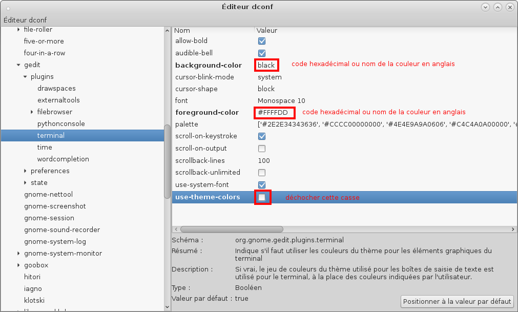 gnome-termnial est installé cette méthode risque de ne pas fonctionner, car le fichier de configuration /usr/lib/x86_64-linux-gnu/gedit/plugins/terminal.py favorise par défaut la configuration de gnome-terminal, dans ce cas là, pour changer les couleurs du Terminal intégré il faudra passer par “Changer les couleurs dans Gnome Terminal” ou “Astuces expérimentales” (voir ci-dessous).