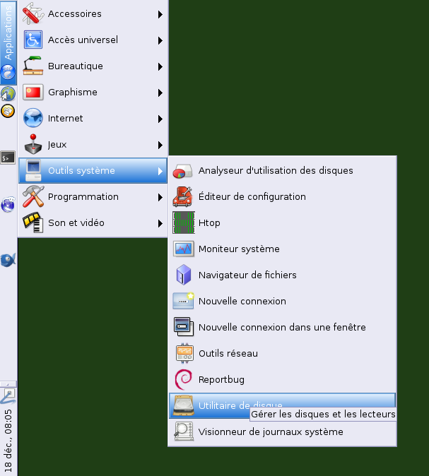 Utilitaire de disque s'ouvre sur le bureau gnome depuis le menu ainsi :