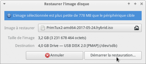 Un message vous informe que le disque de destination est plus grand que l'image à graver. Vous pouvez donc démarrer la restauration.