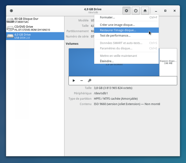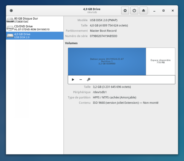 L'utilitaire nommé Gnome-disk-utility, disponible dans les dépôts Debian, permet de restaurer une image disque sur clé USB pour en faire un liveUSB.
