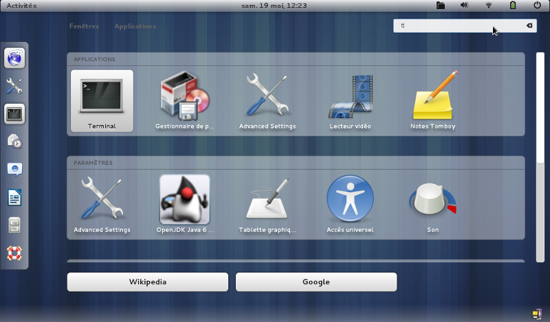 Les deux boutons du bas permettent de lancer une requête sur Google ou Wikipedia, le résultat de la recherche s’ouvrant dans le navigateur.