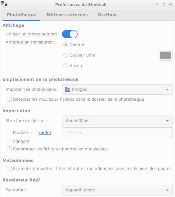 La configuration du logiciel s’effectue à partir du menu Édition – Préférences. On peut choisir où seront copiés les fichiers importés (ici dans le répertoire Images de l’utilisateur) et le mode de classement des photos (ici, par année et mois) :