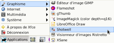 Sous un environnement Xfce, Shotwell est classé sous la rubrique Graphisme du menu des applications :