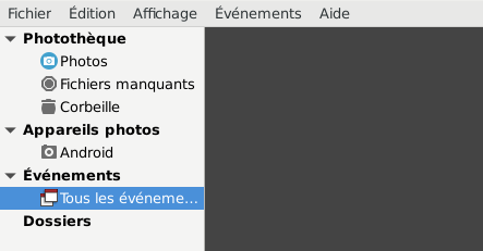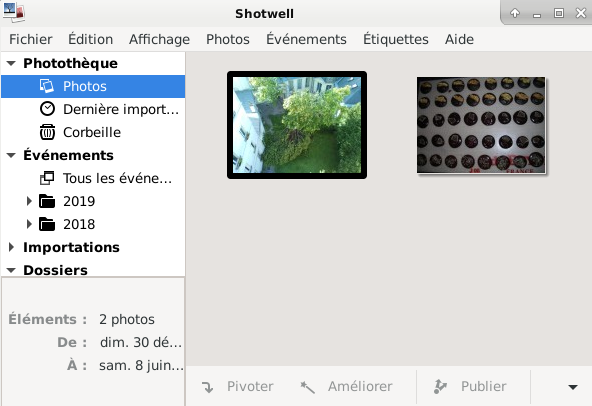 Les photos importées apparaissent dans rubrique Photos de Shotwell et sont triées par année et mois dans la rubrique Événements :