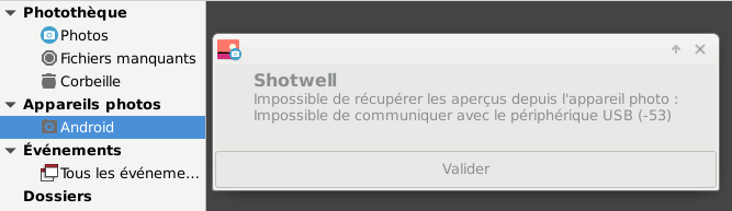 Si par malchance, ce message apparaît alors que le mobile est déverrouillé, le plus simple est de fermer Shotwell, de débrancher le mobile puis de relance Shotwell et à nouveau brancher le téléphone.