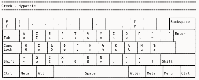 < le code symbolique de la touche >{ et au moins un espace après []} et ;, après l'avant-dernier niveau de touche, après le dernier niveau de touche// est un commentaire, vous pouvez y écrire ce que vous voulezJusqu'à obtenir, par exemple cela : fichier /usr/share/X11/xkb/symbols/grec_hypathie