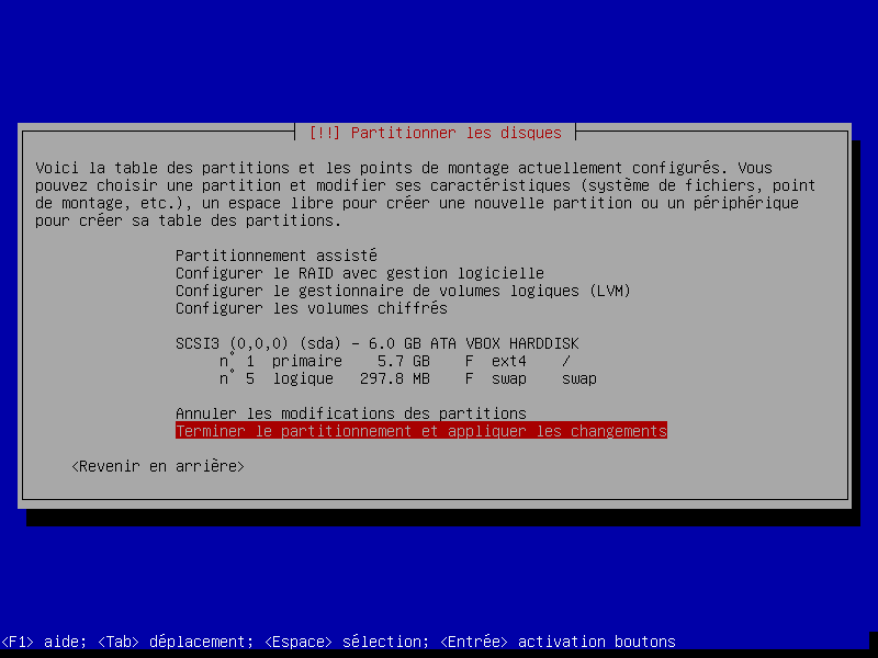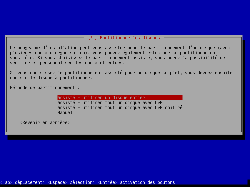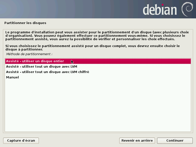 Dans l'exemple que nous vous présentons ici nous avons choisit un partitionnement assisté sur un disque entier. Si vous souhaitez, choisir un partitionnement en mode manuel pour l'adapter à vos souhaits, des conseils sont disponibles: ici
