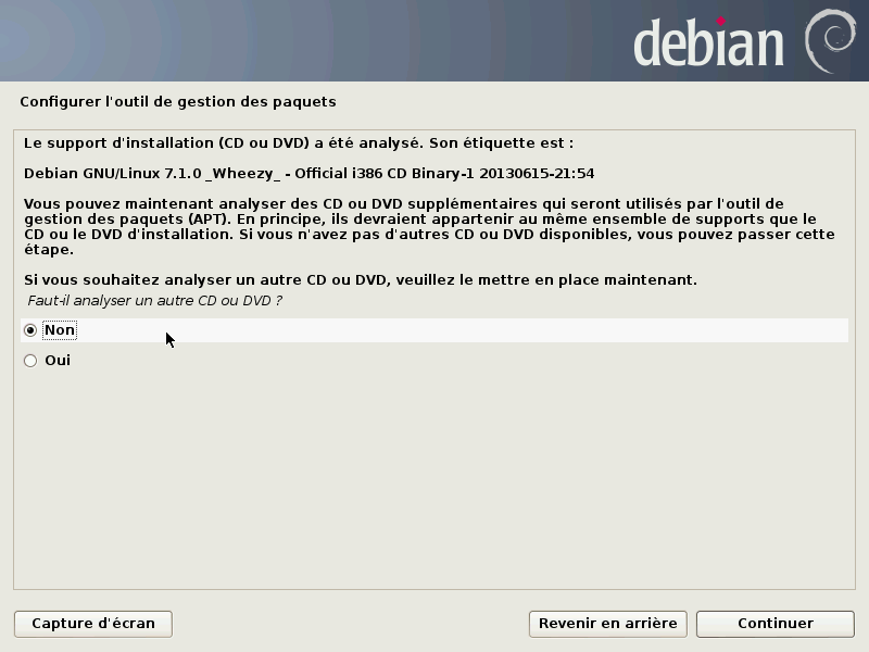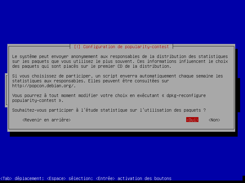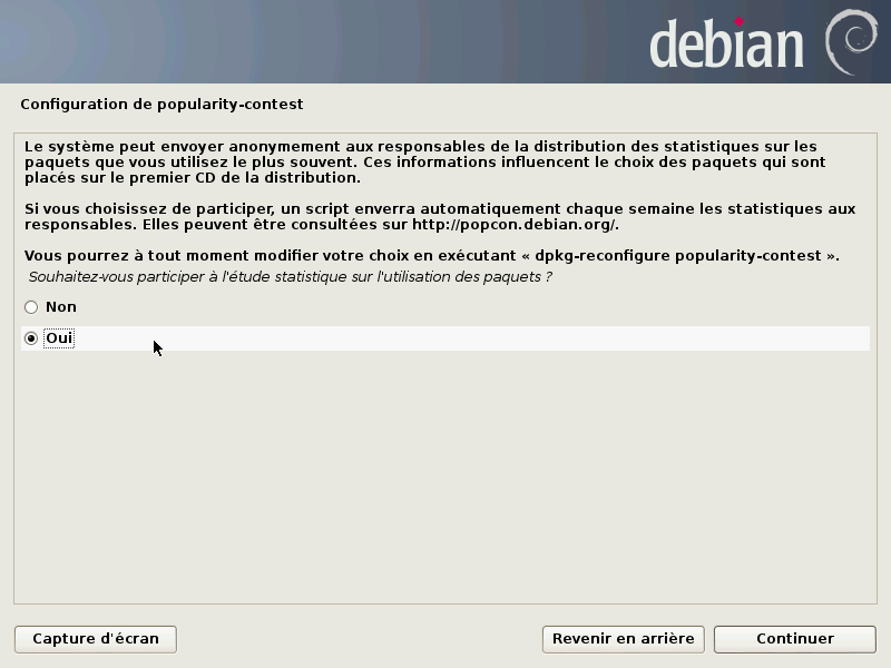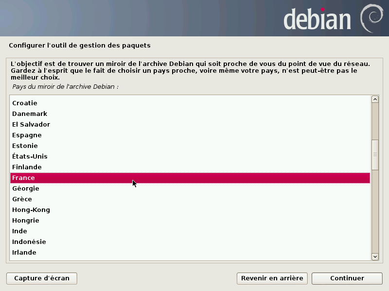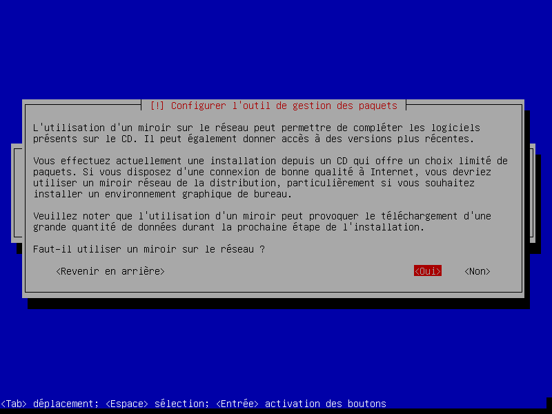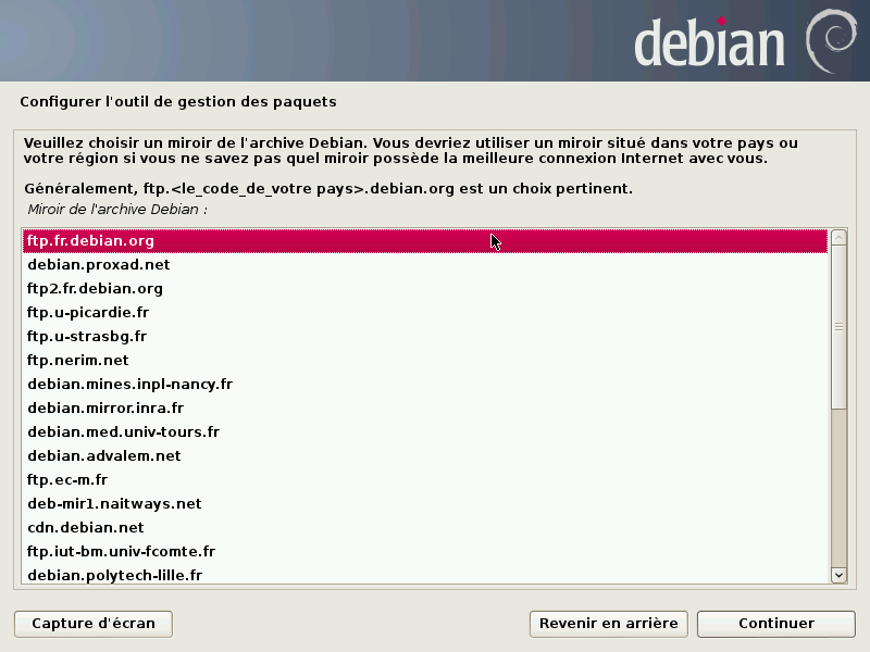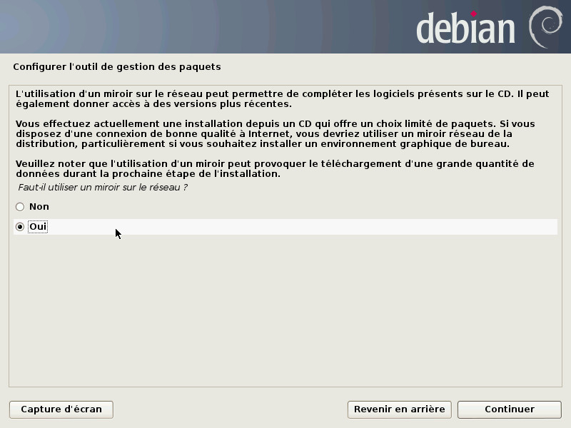 Il existe des serveurs dépôts dans le monde entier, chacun étant une copie de l'autre (miroir). Dans cet exemple nous sélectionnerons “oui” et choisirons dans les cartons qui suivent un miroir FTP situé en France, accessible depuis internet.