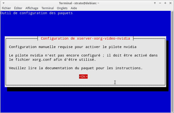 vous affichant qu'il faudra modifier manuellement la configuration de votre machine pour qu'elle fonctionne avec le pilote nvidia - c'est ce que vous ferez ensuite.