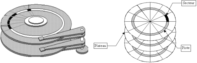 Les faces de ces plateaux sont recouvertes d’une couche magnétique, sur laquelle sont stockées les données. Ces données sont écrites en code binaire [0,1] sur le disque grâce à une tête de lecture/écriture, petite antenne très proche du matériau magnétique.