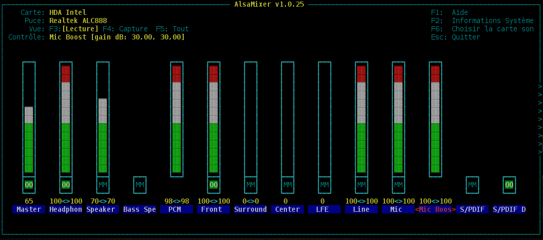 Dans alsamixer, MASTER et PCM doivent être à 80 % et sans qu'ils soient marqués MM2) au-dessus ou en-dessous.