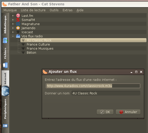 Dans l'arborescence, cliquer droit sur “Vos flux radio”, la boîte de dialogue “Ajouter un flux” s'ouvre.