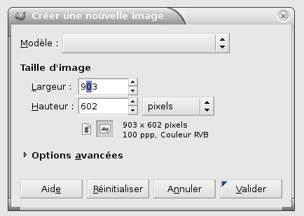 Ici j'ai choisi de passer les paramètres pixel de 3888 et 2592 en 903 et 602 (obtenu automatiquement par l'enchaînement entre les deux) et la Résolution en 100.