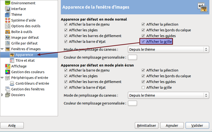 Si vous préférez n'afficher la grille qu'en mode plein écran, dans la section Apparence par défaut en mode plein écran
