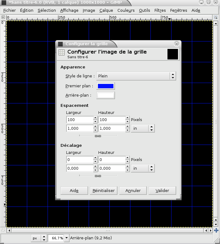 Revenir à l'image initale pour les exercices, 1000×1000 pixel fond noir. Afficher et configurez la grille avec le magnétisme5) activé et choisir une couleur bleue comme ici :