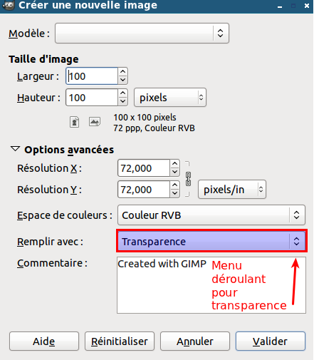 Créer une nouvelle image 100 x 100 pixels avec un fond transparent.
