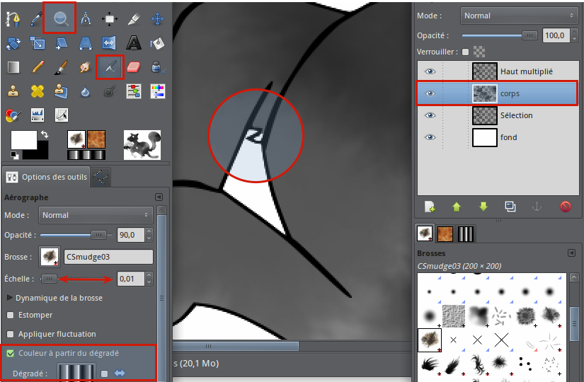 Si vous devez faire des retouches parce qu'il y a une petite partie qui n'est pas colorisée, zoomer dans l'image et corriger avec l'outil aérographe A en vous plaçant sur le calque de la colorisation “corps”. Réduire la taille de la brosse si nécessaire.