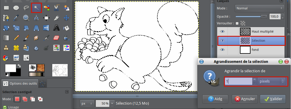 Agrandir votre sélection de 1 pixel par le menu Sélection, Agrandir et validez.