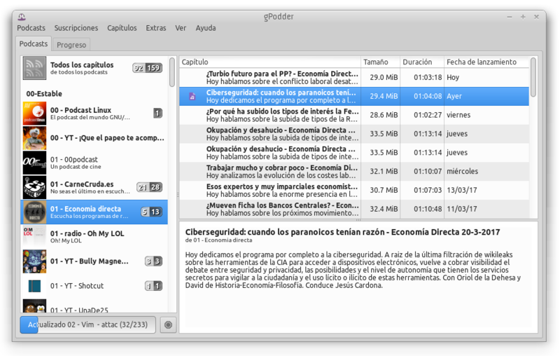 gPodder est un client de réception/capture de podcasts. Il permet de s'inscrire aux flux (« podcasts ») et de télécharger automatiquement les contenus audios et vidéos. Les contenus téléchargés peuvent être lus sur votre ordinateur ou bien synchronisés avec les iPods, les lecteurs basés sur MTP, les lecteurs MP3 et les téléphones portables par le biais du Bluetooth. Les flux vidéos issus de Youtube sont eux aussi lisibles.