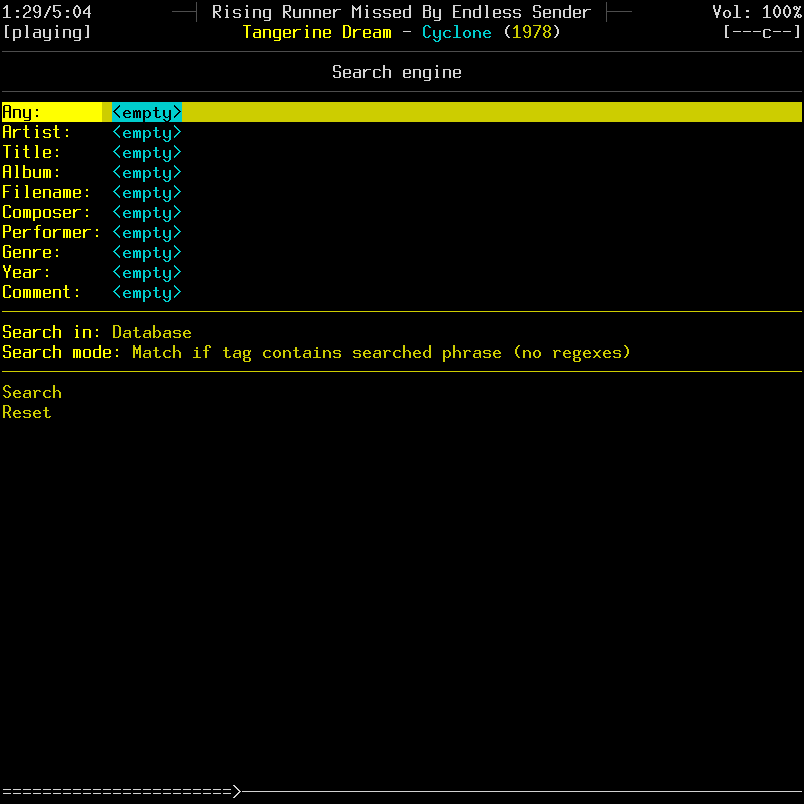 L'entrée search in vous permet de choisir de chercher soit dans la base de données (database), soit dans la liste de lecture courante (current playlist).