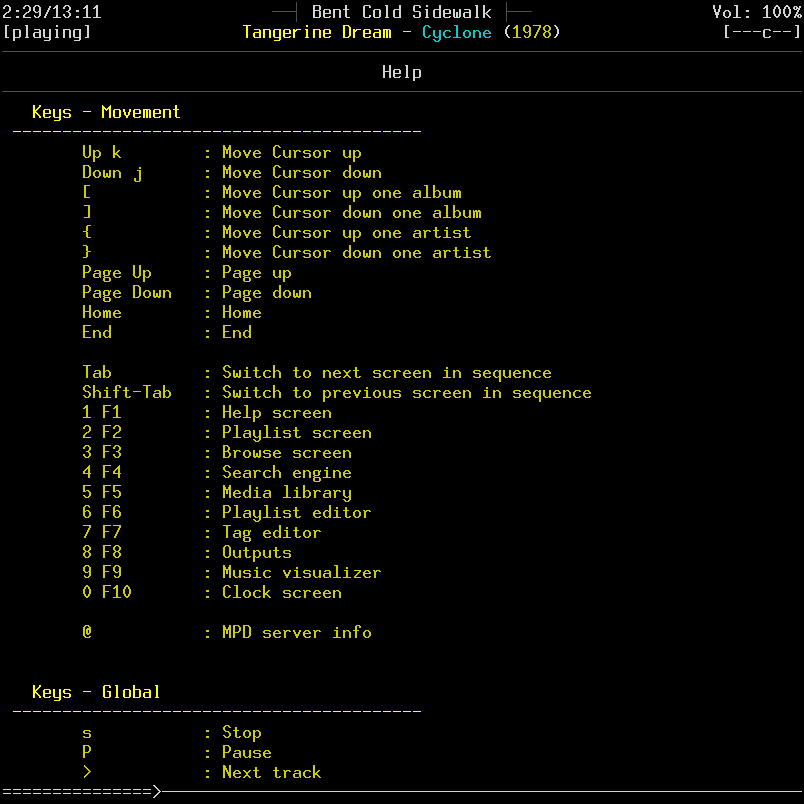 Ncmpcpp est organisé avec plusieurs vues. La vue par défaut est celle qui correspond à la la liste de lecture courante. Pour changer de vue, on utilise les touches de fonction (ou le pavé numérique) :
