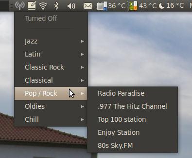 Le clic gauche sur l'icône donne accès au choix des stations tandis que le clic droit permet de configurer radiotray.