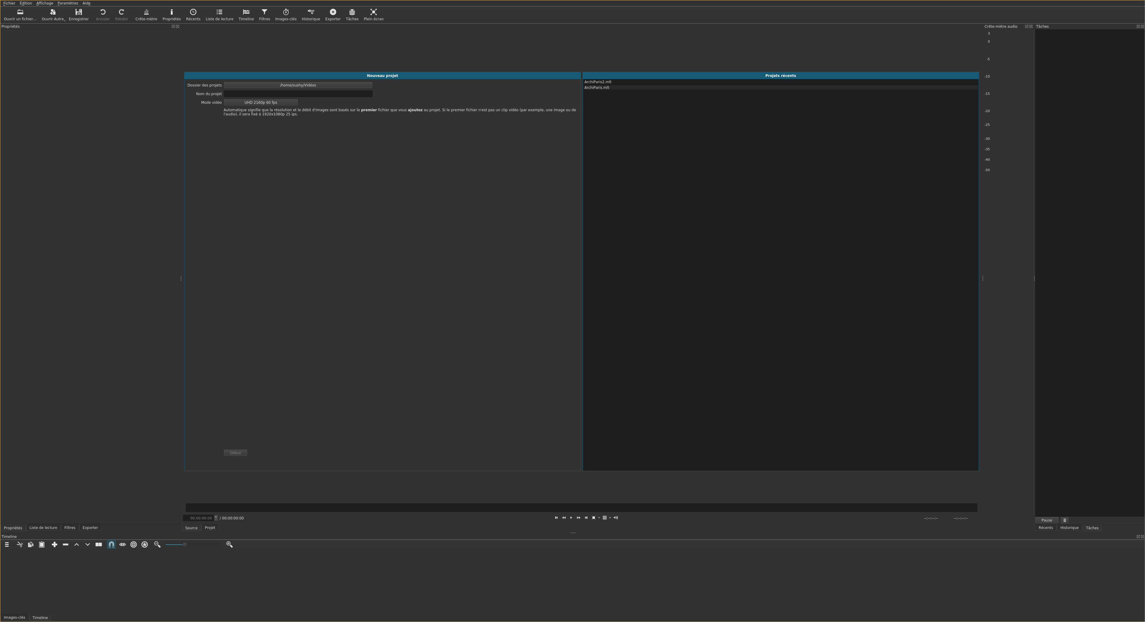 Une fois le logiciel lancé, vous devez choisir à gauche pour créer un nouveau projet (renseigner un nom et le paramètre de la vidéo) ou à droite pour ouvrir un projet existant.