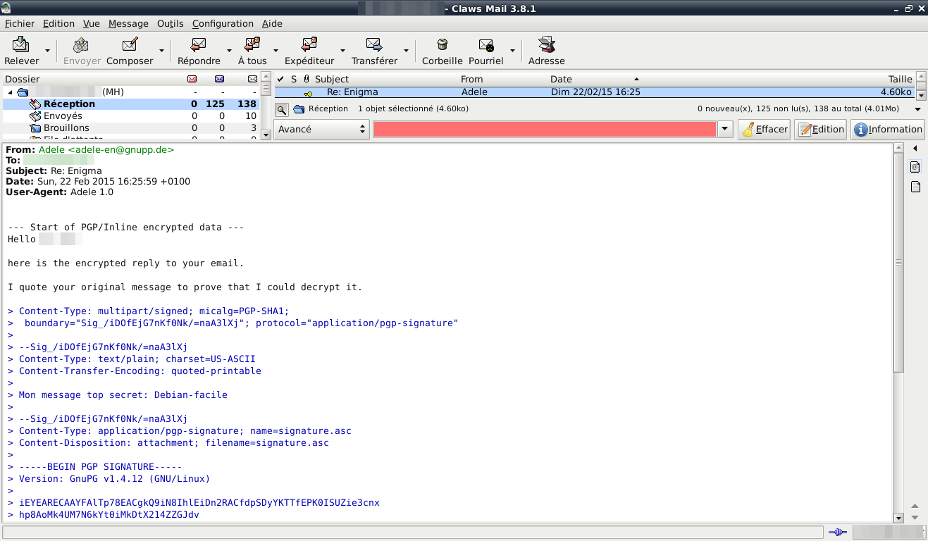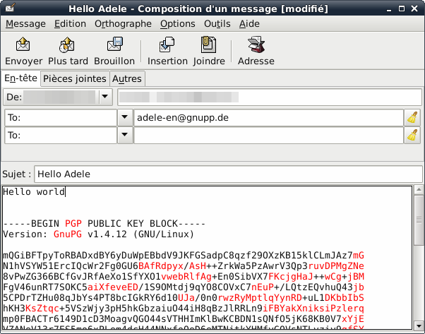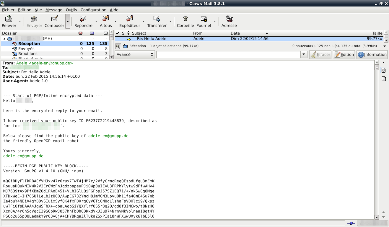 Pour tester le bon fonctionnement de Claws Mail, on va envoyer un message à Adele (the friendly OpenPGP email robot).