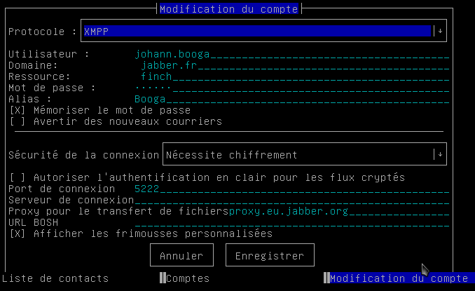 Dans la fenêtre qui suit, choisir le protocole XMPP et saisir ses paramètres de comptes puis Tab ⇆ jusqu'à “Enregistrer”.