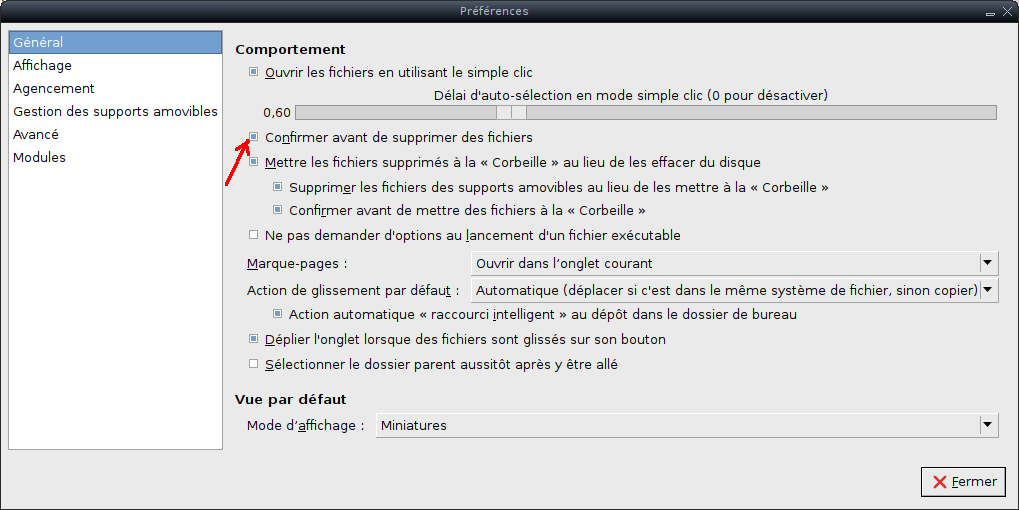 Pour éviter cet écueil, il faut donc modifier le comportement en effectuant une suppression immédiate depuis menu –> Édition –> Préférences.