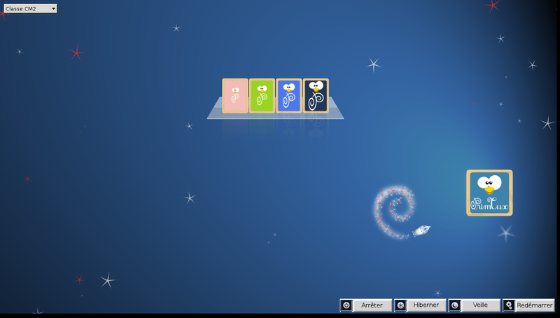 PrimTux propose une interface de connexion simplifiée pour les enfants : 4 images permettent de choisir l'utilisateur parmi mini, maxi, super et administrateur (le maître), et quelques boutons sont disponibles pour contrôler le PC parmi “Arrêter, Hiberner, Veille, Redémarrer”.