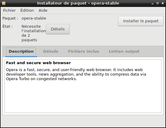 Après un temps d'analyse du paquet (patience…) le bouton Installer le paquet est actif et on a l'information sur les paquets supplémentaires qui seront installés en cliquant sur le boutons Détails (dépendances qui sont installables depuis les dépôts))