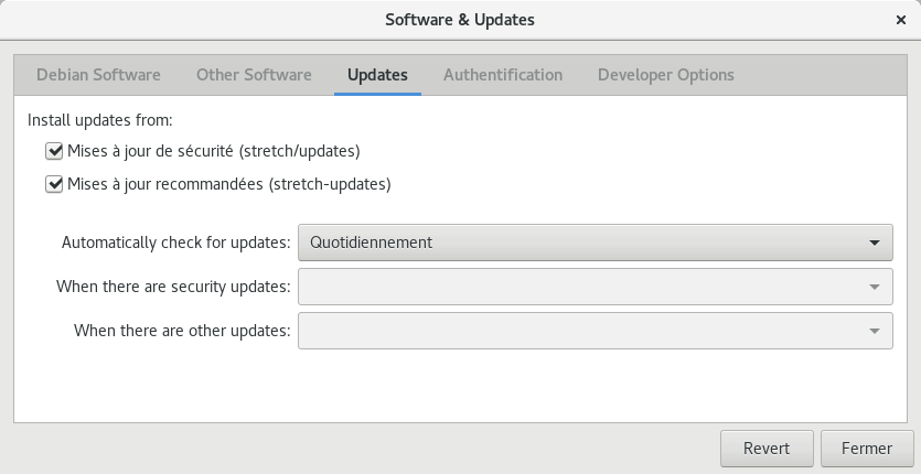 Les cases à cocher sont explicites, cocher ou décocher pour ajouter ou supprimer un dépôt. Dans l'onglet Updates vous pourrez activer ou désactiver les dépôts de sécurité et de mises à jour recommandées ainsi que la fréquence de recherche automatique de ces mises à jour pour Logiciels.