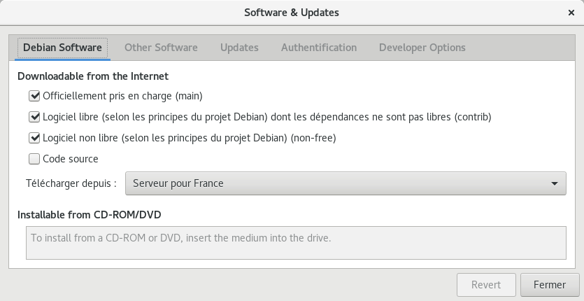 Il est préférable de modifier le fichier sources.list de configuration des dépôts via les outils en ligne de commande.