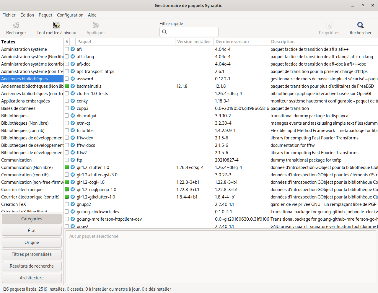 Devant chaque paquet on remarque un petit carré (blanc pour les paquets non installés, vert pour les paquets installés et rouge pour les paquets cassés).