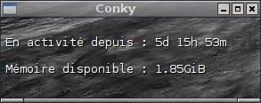 Nous allons tester un Conky modeste mais fonctionnel. Pour cela, je vous propose le fichier de configuration suivant, permettant d'afficher l'uptime du système et la mémoire disponible, le tout dans une fenêtre en fausse transparence.