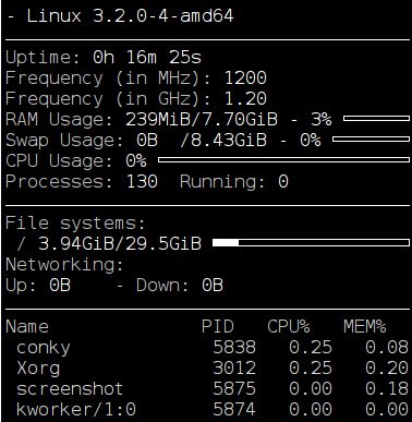En l'absence de fichier de configuration, Conky vous gratifiera d'un affichage des informations les plus couramment recherchées :