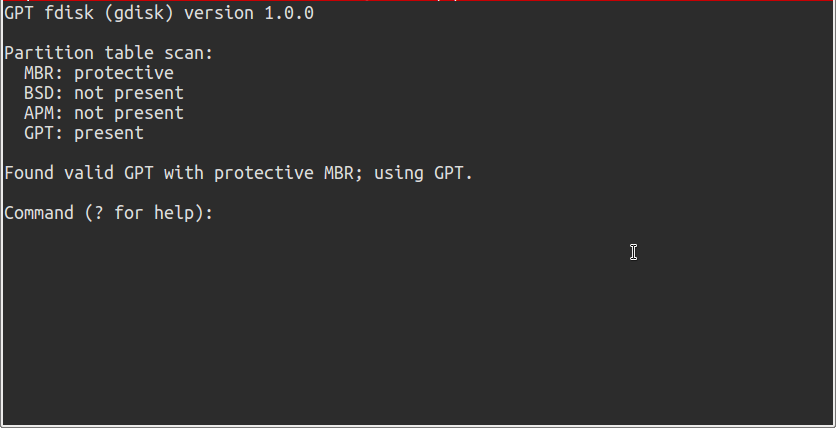 gdisk est un programme de manipulation de table de partitions pour GNU/Linux sous curses ou, si vous préférez, en mode texte. Il sera donc lancé en console ou à partir de n'importe quel terminal en mode administrateur.