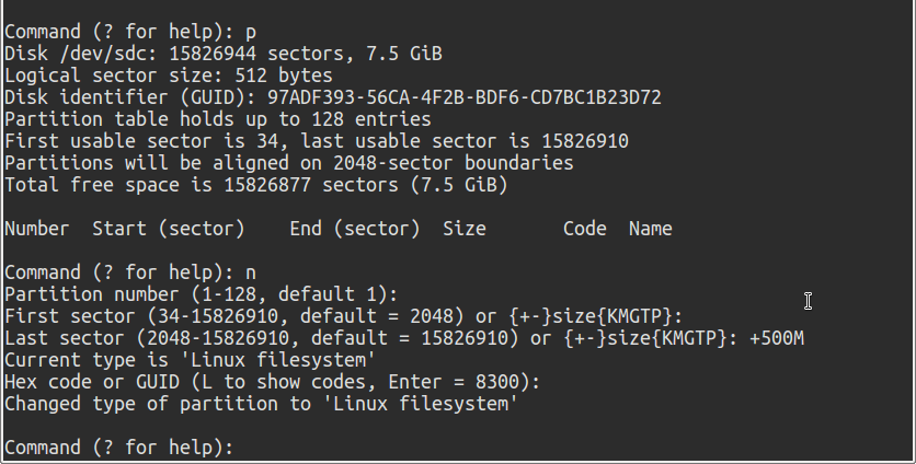 Pour lancer gdisk, il faut préciser le nom du périphérique (préalablement identifié avec lsblk) comme argument.