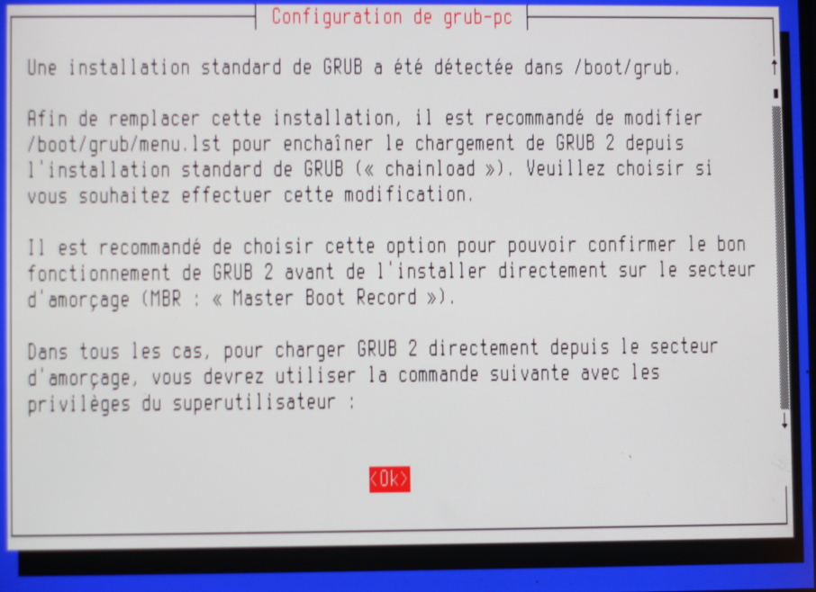 Lorsque tout se passe bien, ou si vous n'avez que la distribution DEBIAN d'installée et qu'elle fonctionne parfaitement, vous pouvez maintenant remplacer le GRUB par GRUB2, en exécutant la commande sous root :