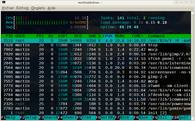 En bas de la fenêtre, une barre de menu liste les raccourcis rapides et les options auxquelles ils correspondent ; par exemple, un appui sur la touche F5 activera l'affichage des processus en arborescence (“tree”), F6 vous permettra de choisir le critère de classement des processus (“sort by”), F9 vous permettra d'envoyer un signal au(x) processus sélectionné(s) (utilisez “man kill” pour la liste des signaux et leur signification).