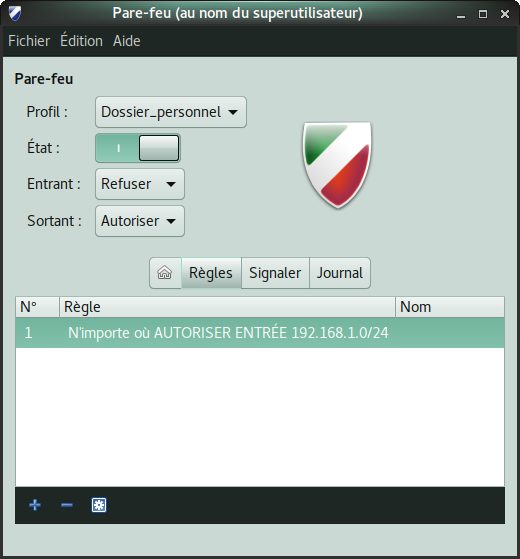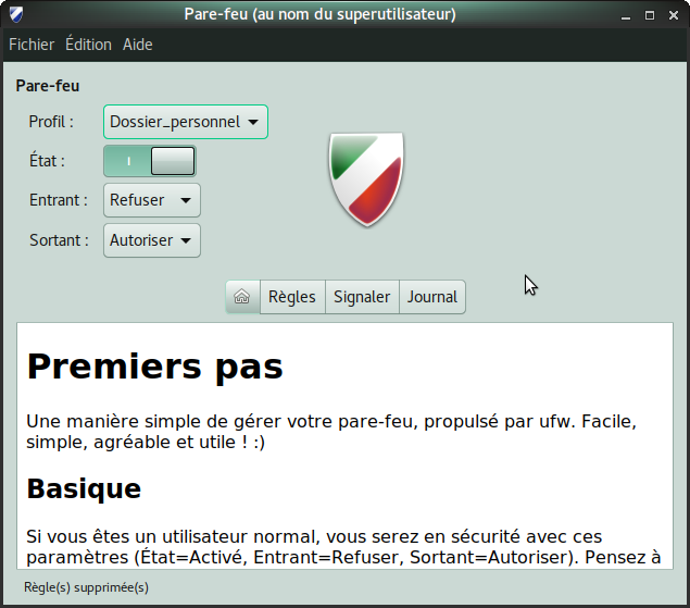 Le pare feu ufw peut être géré (activé et paramétré) via le terminal administrateur ou l’interface graphique gufw.